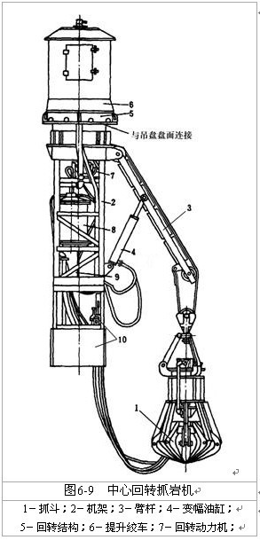 中心回轉(zhuǎn)抓巖機(jī)是一種大斗容抓巖機(jī),它直接固定在鑿井吊盤上,以壓風(fēng)作為動力,該設(shè)備具有使用范圍廣、適應(yīng)性強(qiáng)、設(shè)備利用率高、動力單一、結(jié)構(gòu)緊湊、占用井筒面積不大,便于井筒布置、安全可靠、操作靈活、維護(hù)方便等優(yōu)點(diǎn),目前在煤炭礦山得到了普遍的使用。該機(jī)由抓斗、提升機(jī)構(gòu)、回轉(zhuǎn)機(jī)構(gòu)、變幅機(jī)構(gòu)、支撐系統(tǒng)和機(jī)架等部件組成,見圖6-9。