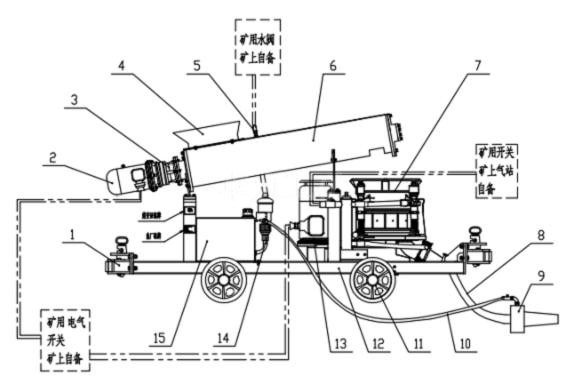 1、碰頭 2、電動機(jī) 3、減速機(jī) 4、進(jìn)料斗 5、進(jìn)水管路 6、攪拌機(jī) 7、噴射機(jī) 8、輸料管 9、噴頭10、輸液膠管 11、礦車輪對 12、車架 13、電動機(jī) 14、速凝劑泵 15、速凝劑箱